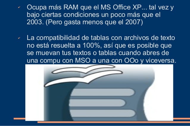 5. ✔ Ocupa más RAM que el MS Office XP... tal vez y bajo ciertas condiciones un poco más que el 2003. (Pero gasta menos que el 2007)✔ La compatibilidad de tablas con archivos de texto no está resuelta a 100%, así que es posible que se muevan tus textos o tablas cuando abres de una compu con MSO a una con OOo y viceversa.